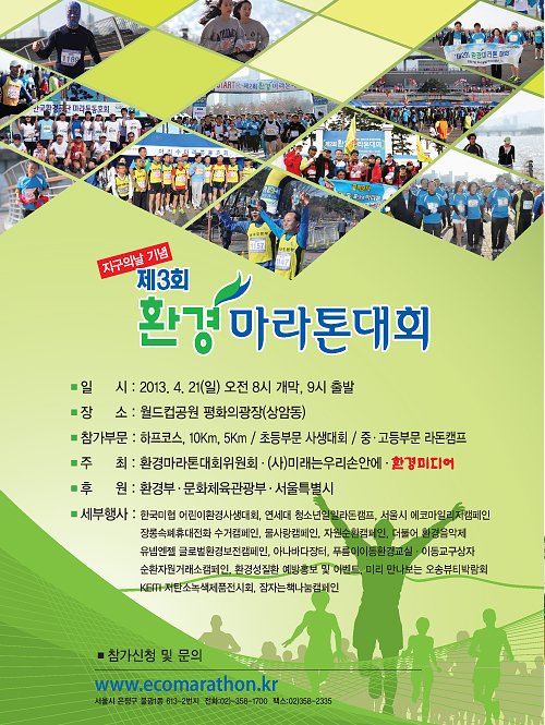 친환경 실천을 홍보하기 위한 지구의 날 기념 제3회 환경마라톤대회가 4월 21일 오전 8시부터 정연만 환경부차관을 비롯해 마라톤애호가 3000여명이 참여한 가운데 서울 상암동 월드컵공원 평화의광장에서 개최된다.