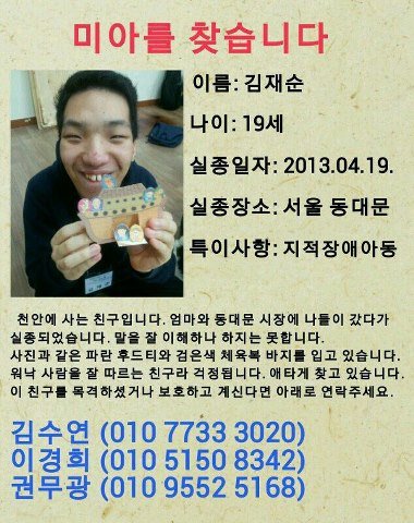 미아를 찾습니다! 실종일자 4월 19일 서울동대문에서 실종! <한국유통신문>