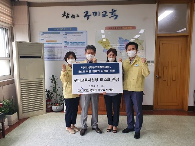 (전국= KTN) 김도형 기자= 경상북도구미교육지원청(교육장 신동식)은 9월 18일(금) 구미교육지원청 교육장실에서 구미시학부모회장협의회(회장 이혜민)의 마스크 착용 캠페인 지원을 위한 ‘KF80 방역 마스크 증정식’을 가졌다. 이번 마스크 증정은 지난 9월 15일(화) 구미시학부모회장협의회의 결과로 홍보용 마스크 600장을 기증했다.