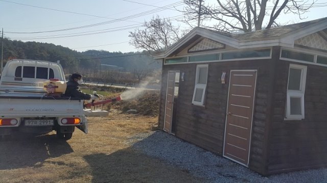 2월 24일 09:00부터 관내 버스 승강장 29개소, 공중화장실 6개소, 요양시설 2개소, 사찰1개소, 교회 4개소, 16개 경로당 및 마을회관에 옥성면직원 및 각 마을이장이 참여하고 휴대용 방역기 5대를 동원하여 방역을 실시 하였으며, 집단생활을 하는 요양시설 및 다중이용이설에 소독약품을 지급하고 철저한 방역을 지도했다.