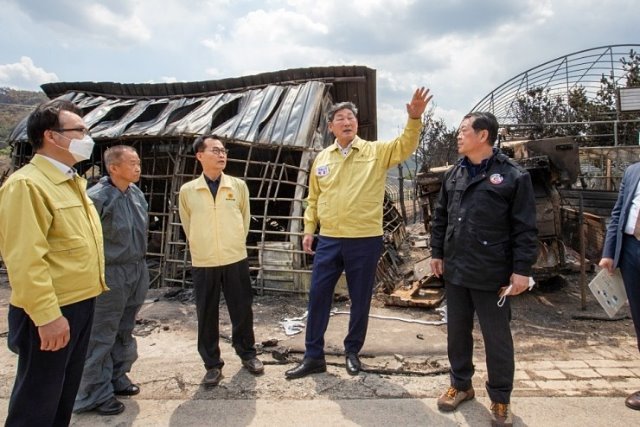 (전국= KTN) 김도형 기자= 경상북도의회 장경식 의장과 농수산위원회 김성진 의원은 4월 27일 산불 피해 농가를 입은 안동시 남후면 고하리 돈사를 방문해 농장 주인을 위로하고 향후 피해보상 대책 등을 함께 논의했다.