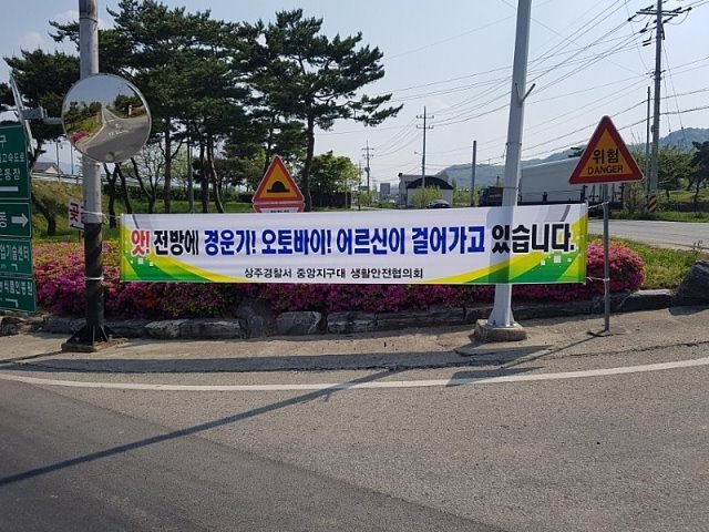 (전국= KTN) 김도형 기자= 상주경찰서 중앙지구대 생활안전협의회(위원장 이인규)는 농번기를 맞이하여 5월 11일, 관내 교통사고 다발지역(개운동-외남 경계, 남부초교 부근, 남부주유소-오대, 흥각동 등 9개소)에 교통사고 예방 현수막(“앗! 전방에 경운기!, 오토바이!, 어르신이 걸어가고 있습니다.”)을 게첨했다.