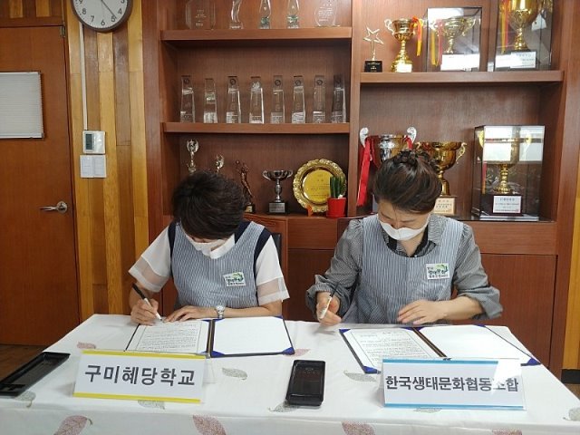구미혜당학교(교장 박현숙)는 2020년 7월 20일(월) 한국생태문화협동조합(이사장 이은숙)과 구미혜당학교 초등학생들의 숲체험활동 수업활동 지원 및 학생 위생관리를 위한 교사용 앞치마 제작 지원을 위한 업무협약을 체결했다.