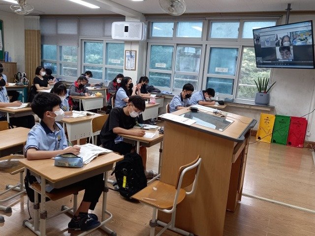 형남중학교 격리된 교사와 학생, 등교한 학생 모두가 함께 하는 실시간 화상 수업 진행