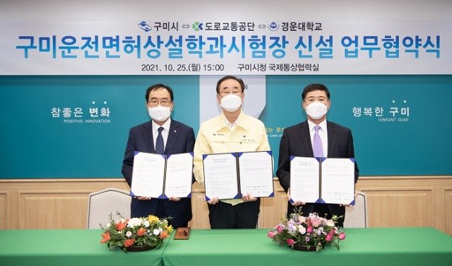 (전국= KTN) 김도형 기자= 구미시(시장 장세용)는 10월 25일(월) 구미시청 1층 국제통상협력실에서 장세용 구미시장, 남택화 도로교통공단 운전면허본부장, 한성욱 경운대학교 총장 3개 기관의 대표가 참석한 가운데 구미운전면허상설학과시험장 신설을 위한 업무협약을 체결했다.