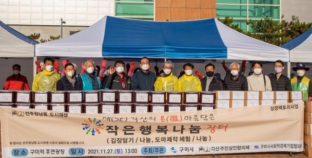 당해 “작은행복나눔장터”사업은 구미시사회적경제기업협의회(회장 박동식)와 각산마을주민상인협의체(회장 조일성)의 긴밀한 상호 협력으로, 지역 취약계층에게 전달할 김장담기와 방역키트구매, 도마 만들기 체험등을통해 지역취약계층에게 공급하였다.