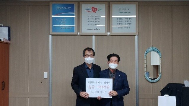 홍병표 부계면장은 “희망2022 나눔 캠페인을 시작하는 시점에 모범을 보여주신 홍이근님께 감사드리며 따뜻한 마음이 전해질 수 있도록 최선을 다하겠다”고 말했다.