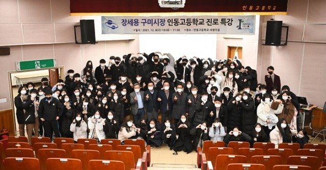(전국= KTN) 김도형 기자= 구미시(시장 장세용)는 12월 8일(수) 10:00, 인동고등학교에서 대학수학능력시험을 치른 고등학교 3학년 학생들을 대상으로「일상회복! 현장을 잇다」소통의 일환인 진로특강을 개최했다.