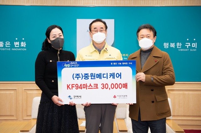 장세용 구미시장은 “(주)중원메디케어에서 기부해 주신 마스크는 시민의 안전을 지켜낼 값진 나눔”이라며 “나눔의 손길에 힘입어 코로나19 확산방지를 위해 최선을 다하겠다.”고 전했다.