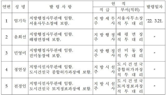구미시청 인사발령 2022년 3월 21일자 5급 승진