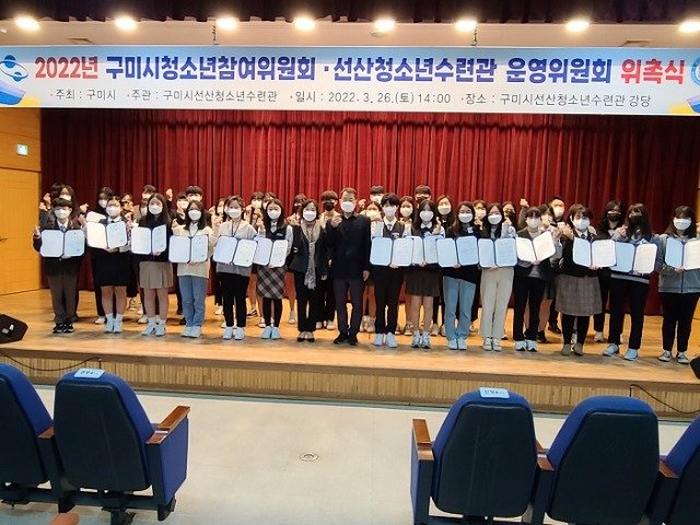 (전국= KTN) 김도혀 기자= 구미시(시장 장세용)에서는 3월26일(토요일) 오후2시 선산청소년수련관 대강당에서 구미시청소년참여위원회 및 선산청소년수련관 청소년운영위원회 위촉식을 가졌다.