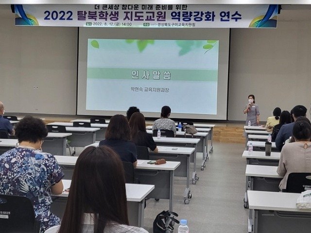 (전국= KTN) 김도형 기자= 경상북도구미교육지원청(교육장 이성희)은 8월 12일(금) 새마을운동 테마공원 글로벌관 다목적홀에서 구미시 외 12개 시군의 탈북학생 지도교원과 지역교육지원청 업무담당자, 희망교원 등 40명을 대상으로 역량강화 연수를 실시하였다.