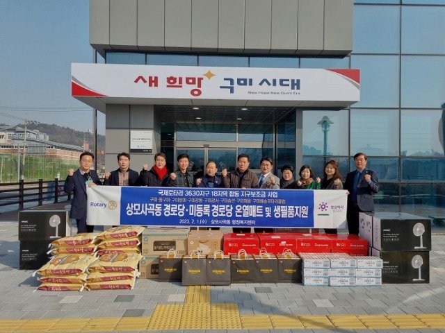 이날 국제로타리3630지구 18지역 로타리클럽은 선풍기 17대, 탄소매트 18개, 쌀 17포/20kg, 김세트 17박스, 식용유 17세트 등 500만원 상당의 생필품을 기탁했으며, 후원품은 상모사곡동 관내 경로당 및 저소득 가정에 전달하여 지역의 어르신과 어려운 이웃들이 따뜻한 겨울을 보낼 수 있도록 할 예정이다.