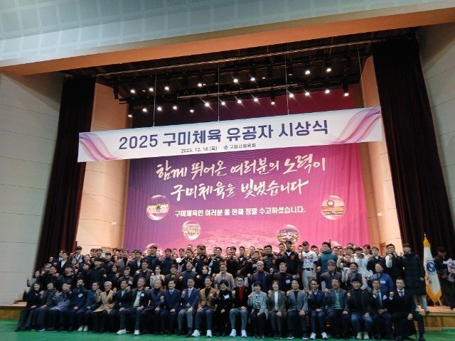 [한국유통신문= 전옥선 기자] 12월 18일, 구미시체육회(회장 윤상훈)가 주최한 ‘2025년 구미체육 유공자 시상식’이 구미시 체육인과 관계자 등 400여 명이 참석한 가운데 성황리에 열렸다. 이날 행사에는 김장호 구미시장, 박교상 구미시의회 의장을 비롯한 체육 관계자와 선수들이 함께해 한 해 동안 구미체육의 성과를 공유했다.