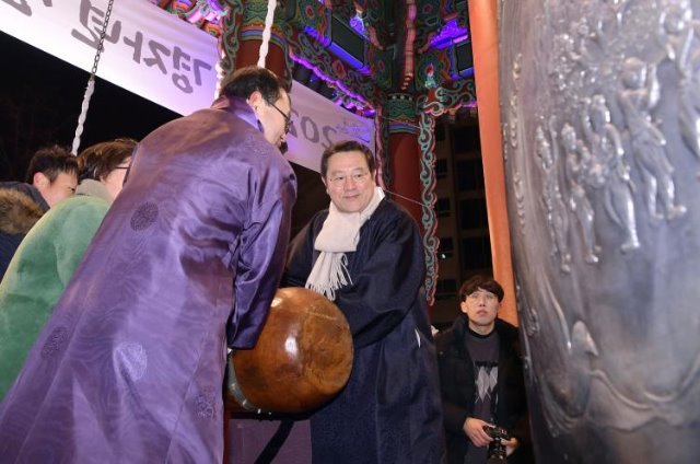 (전국= KTN) 윤진성 기자=이용섭 광주광역시장이 31일 밤 동구 금남로 5·18 민주광장에서 열린 '2020년 송·신년 시민축제'에 참석해 시민들에게 주먹밥을 나눠준 뒤 1일 0시 김동찬 광주시의회 의장, 장휘국 광주시교육감, 국회의원, 시민 등 참여자들과 제야의 종을 울리며 새해 희망을 다짐하고 있다
