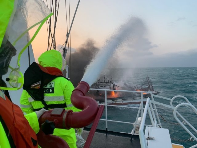 현재 승선원 6명의 건강상태는 양호하며, 해경 경비함정 9척이 소화포 이용 화재진압 중에 있다.