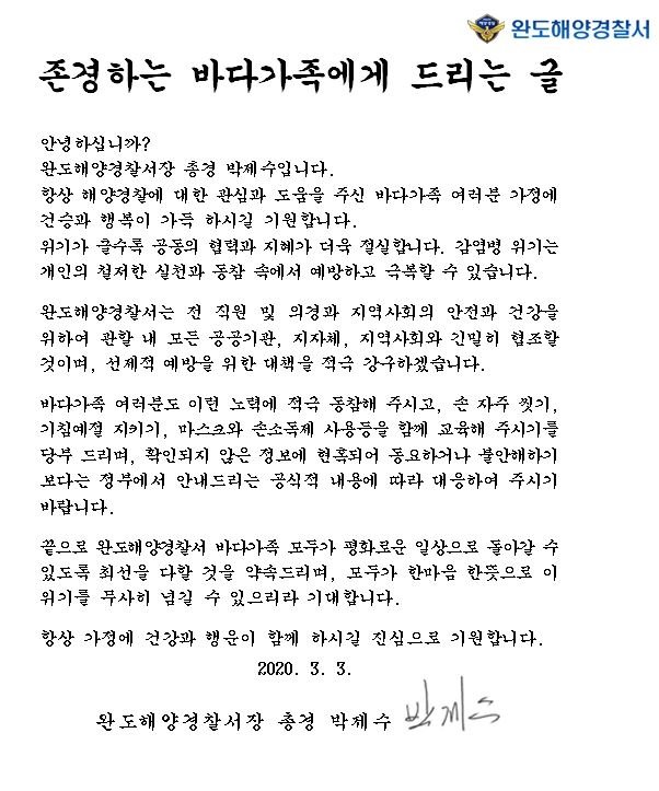 박제수 완도해경서장은 서한문을 통해 “완도해경은 소속 전 직원과 의경을 대상으로 감염병 예방을 위한 선제적 대응에 총력을 다하고 있으며 종합상황대책팀을 가동하여 24시간 비상근무 태세를 유지하고 있다”고 말했다.