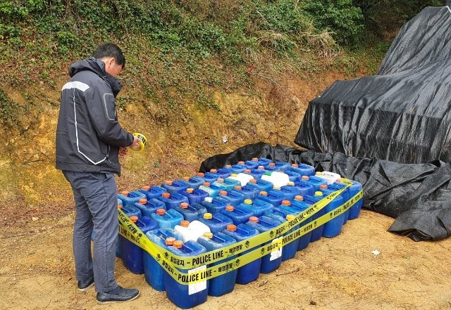 완도해경에 따르면 31일 오후 5시 30분경 완도군에 위치한 A섬에서 형사기동정(P-133) 소속 경찰관 2명이 육상 형사활동 중 B씨(남, 59세)가 인근 야산에 숨겨둔 무기산 50통을 적발하여 압수 조치하였다.