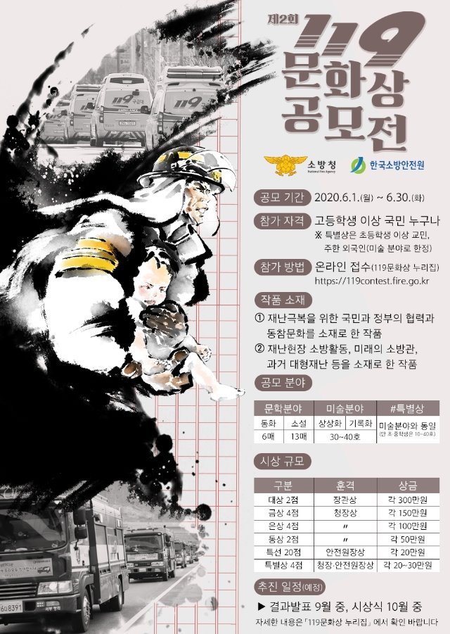 119문화상 공모전은 문학과 미술작품을 통해 안전문화를 확산시키고, 소방에 대한 이해와 가치를 높이기 위해 작년부터 개최되고 있다.