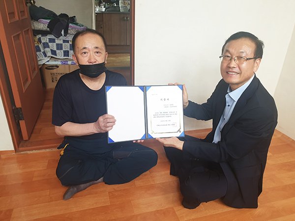 아울러, 금번 주택 무상임차자금 전달과 함께 전남동부보훈지청에서 6·25전쟁 70주년을 기념하며 개최된 시화전의 고등부 수상자들이 기부한 위문품(두유16박스)을 전달하여 더욱 뜻깊은 시간이 되었다.