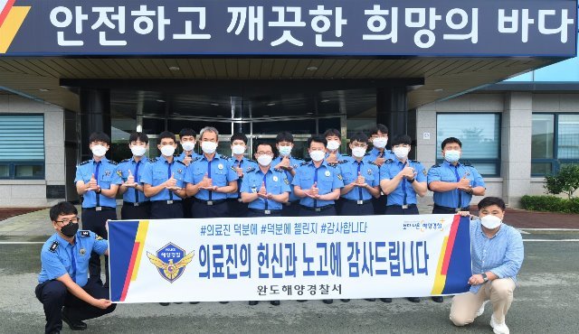 박제수 완도해경 서장은“코로나19극복을 위해 무더운 여름에도 일선에서 질병과 싸우고 있는 의료진과 방역관계자들에게 우리의 응원이 조금이나마 힘이되었으면 좋겠다”며 “완도해경은 코로나 방역지침을 철저히 준수하며 코로나19 극복을 위해 힘을 보태겠다”고 전했다.
