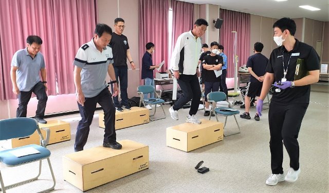이번 체력검정은 2020년도 직장훈련 체력검정 평가항목 개편에 따라 국민체육진흥공단 전담 출장팀 위탁 검정으로 ‘국민 체력 100’프로그램으로 실시하며 코로나19 확산방지를 위해 방역 관리 요원의 철저한 관리 속에 대기자간 거리 두기를 유지한 채 진행 중이다.