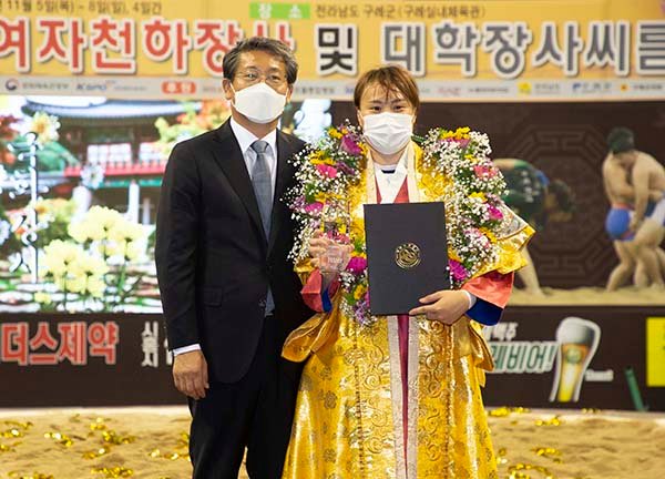 (전국= KTN)윤진성 기자=7일 김순호 구례군수가 구례실내체육관에서 개최된 제12회 구례전국여자천하장사 및 대학장사씨름대회에서 여자씨름 국화급에 장사로 등극한 엄화진(구례군청 소속)선수에게 꽃다발과 우승 트로피를 전달하고 기념촬영을 하였다.