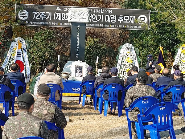 (전국= KTN)윤진성 기자=전남동부보훈지청(지청장 김영진)은 지난 11월 14일 구례군 산동면 소재 ‘백인기대령추모비’ 앞에서 자유와 평화를 지키기 위해 고귀한 생명을 바친 故백인기 대령의 넋을 추모하고 숭고한 호국정신을 후세에 알리고자 ‘제9회 백인기 대령 추모제’를 개최했다.