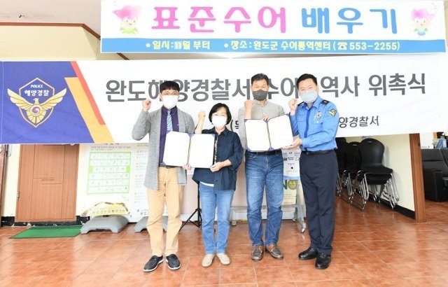 완도해경은 청각ㆍ언어 장애인들이 해양에서 발생하는 사건과 안전ㆍ홍보 내용전달에 어려움을 겪고 있음을 파악하고 수어통역센터와 협의를 거쳐 박창남, 김예환 통역사 2명에게 위촉장을 수여하였다.