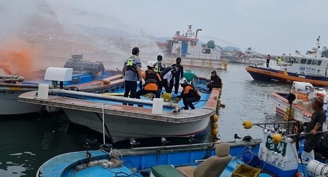 (전국= KTN) 윤진성 기자=완도해양경찰서(서장 김정수)는 8월 30일, 해남 송지면 어란진항에서 항포구 정박어선 화재 발생을 가정한 민ㆍ관 합동 화재진압 훈련을 실시했다고 밝혔다.