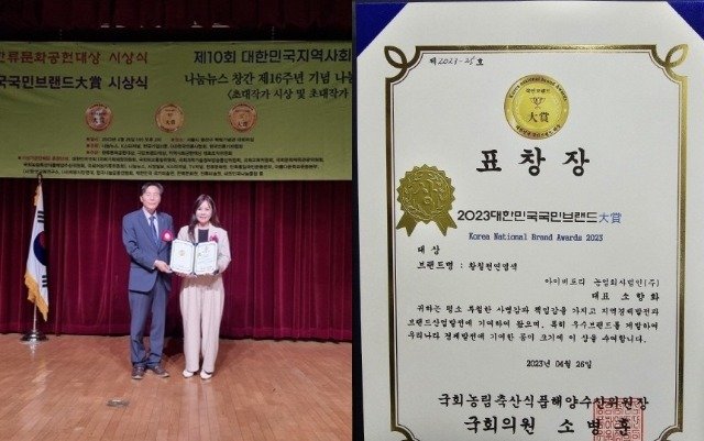 (전국= KTN) 윤진성 기자=2023년 4월 26일(수) 오후 2시 백범기념관 대회의실에서 나눔뉴스, K스타저널, 한국기업신문, (사)한국언론사협회, 한국언론기자협회 주최로 열린 대한민국국민브랜드대상 시상식에서 아이비트리농업회사법인(주) 소향화 대표는 제주 자생 황칠나무를 관광자원화하여 황칠천연염색을 브랜드화 시킨 공로를 인정받아 2023대한민국국민브랜드 大賞(국회농림축산식품해양수산위원장, 국회의원 소병훈)수상의 영예를 안았다.