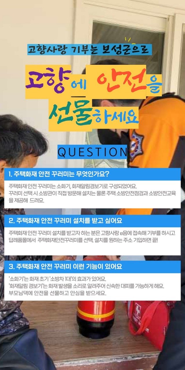 김석운 서장은 “고향사랑 기부로 고향사랑을 실천하고 더불어 고향 부모님에게 안전을 선물할 수 있는 주택화재 안전 꾸러미에 많은 관심을 가져주길 바란다”고 말했다.
