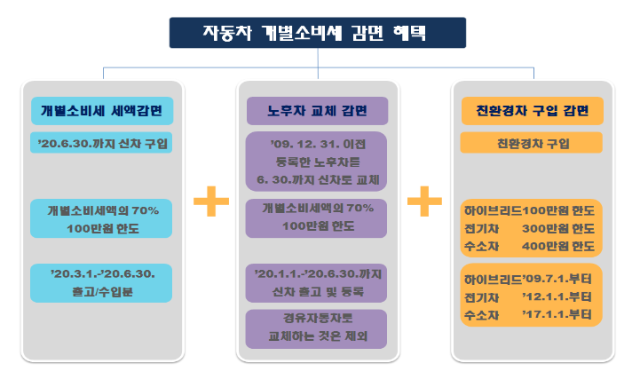 (세종= KTN) 전윤지 기자=정부는 내수회복을 지원하고, 코로나19로 취약해진 민생경제의 안정을 도모하기 위해 ’20.3.1.부터 자동차 개별소비세를 감면한다.