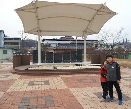 경북 선산 이문리 서당 마을 장원방 기념비 앞에서 2014년 11월 27일 경 미래 인재 아이들 기념사진