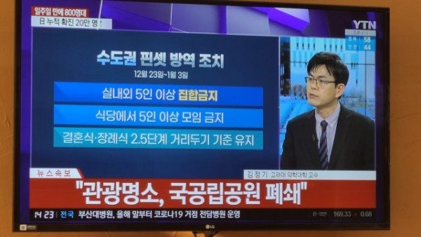 Explain the picture: The re-proliferation of COVID-19 on December 22, 2020 has issued an order to ban gatherings of more than five people indoors and outdoors. I asked people. A four-member family would be okay, but if the baby in your wife's womb is included, isn't it a five-member family?