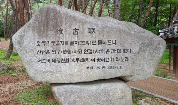 사진 설명: 금오산 채미정 앞에 놓여 있는 야은 길재 선생의 회고가. 고려왕조를 회고하며 흥망성쇠의 무상함을 노래했다.