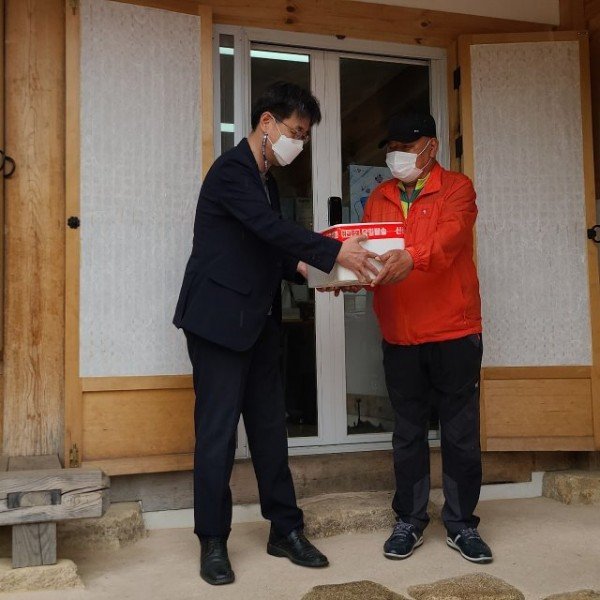 Photo description: A warm love sharing site for senior Cho Je-ha, an elderly man living alone in Wonpyeong 2-dong, and a delivery ceremony by Ryu Young-chul, director of Gumi Neo-Confucian History Museum.
