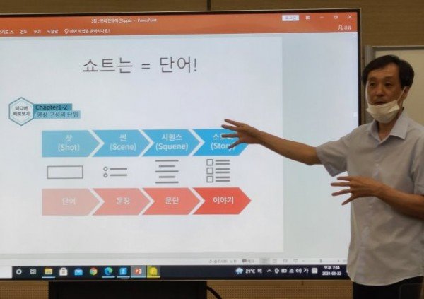 사진 설명: 영상언어의 특징에 대해 설명하는 김창래 감독