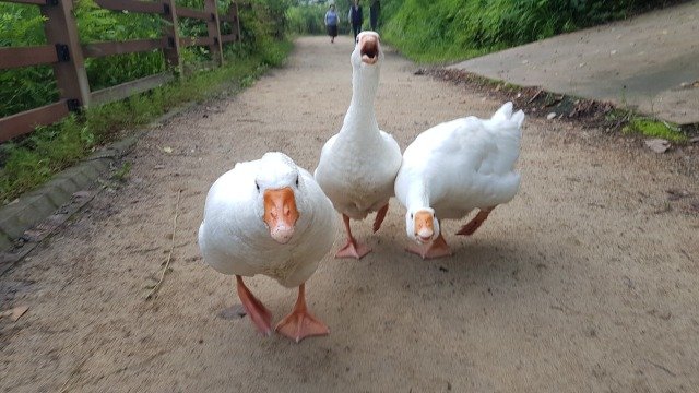 거위가 가족들을 보호하기 위해 지나가는 사람들에게 다가와 경고의 소리를 내지른다.