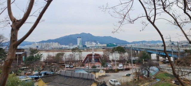사진 설명: 인동나루터에서 본 금오산 전경, 누워있는 사람처럼 보인다.