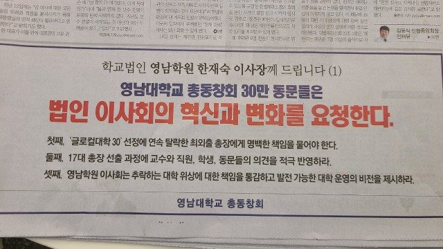 사진 설명: 영남학원 법인 이사회의 혁신과 변화를 요청하는 영남대학교 총동창회 신문광고