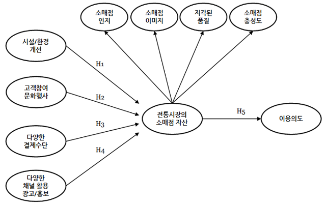 연구모형(출처: 전통시장 활성화 방안이 전통시장의 소매점 자산과 이용의도에 미치는 영향' 연구논문)