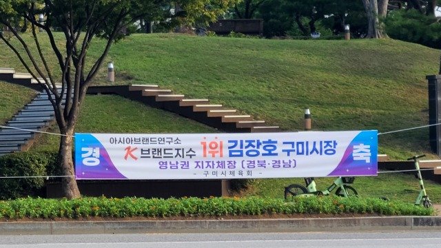 구미시선거관리위원회 즉각 철거 경고에도 불구하고 구미시청 앞에 수일간 게시된 불법현수막