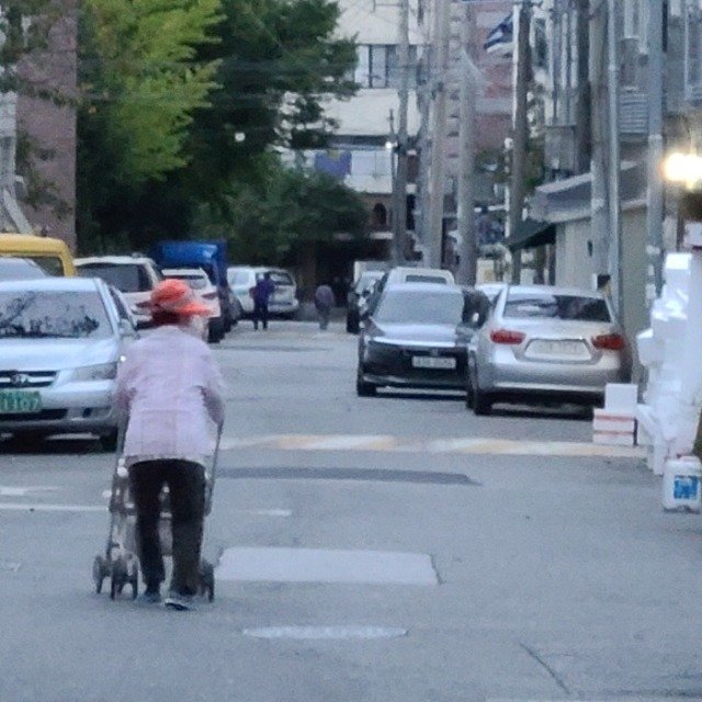 아침 일찍 유모차에 폐지를 가득 채우려는 야심을 가진 동네 할머니의 아침 산책, 하루 온종일 다녀도 5천원을 벌기 힘들다고 한다.