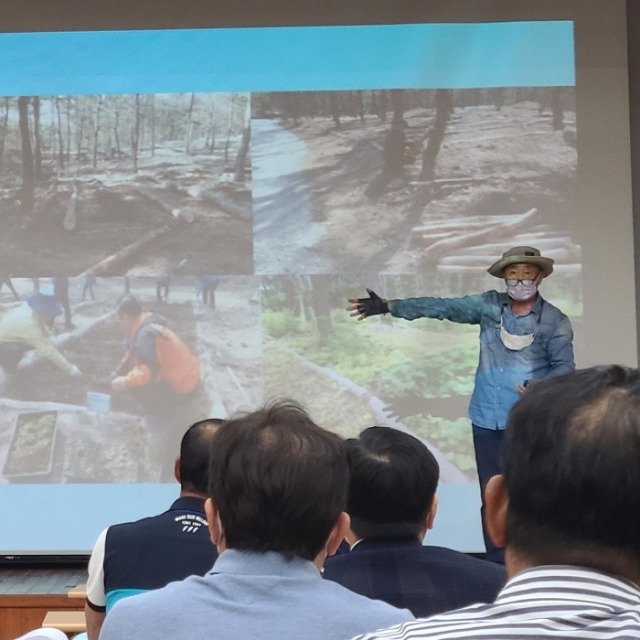 백마강마을공동운영위원장 김은현 산림경영인협회 부회장의 산림융복합 비지니스전략 강연 현장, 산촌계의 마이더스의 손으로 불릴만한 인물이다.