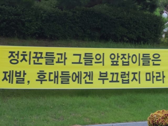 구미시청 앞에 게시된 정치꾼들과 하수인들을 질타하는 현수막, 선거철이 다가 오면 소모적인 논쟁과 비판이 난무하는 현 풍토를 나무라고 있다.