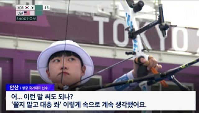 세계 최고의 궁사를 가르는 절체절명의 상황에서 안산 선수가 사용한 마인드콘트롤은 "쫄지 말고 대충 쏴" 이렇게 속으로 계속 생각했다고 말한다.