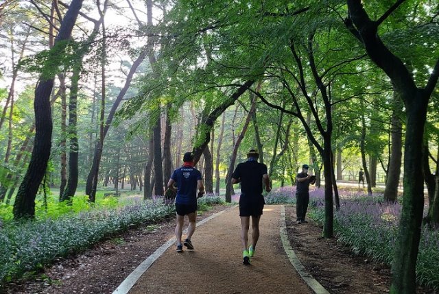 금오산 맥문동 숲, 일요일 아침부터 조깅과 산책하는 인파가 몰려든다