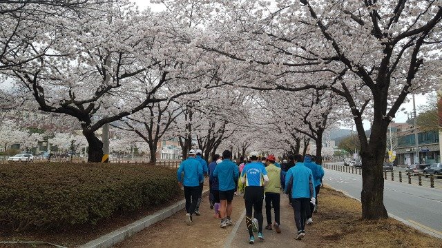 사진 설명: 벚꽃이 활짝 핀 금오천 일대를 달리는 사람들