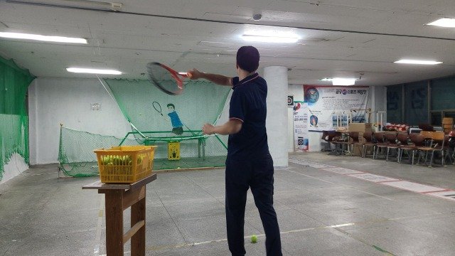사진설명: 구미테니스카페에서 레슨을 받고 있는 테니스 입문자